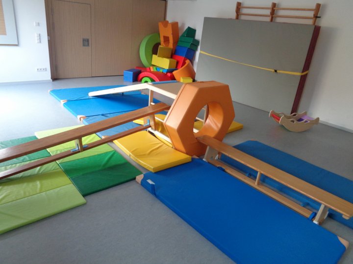- ein Turnraum mit zahlreicher Geräteaustattung (Bodenmatten, Sprossenwand, usw.), welcher den Kindern vielseitige Bewegungsmöglichkeiten bietet und sie somit viel Platz zum Austoben haben.